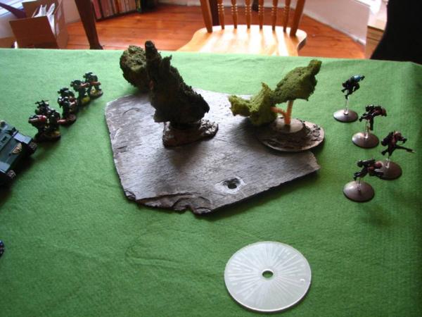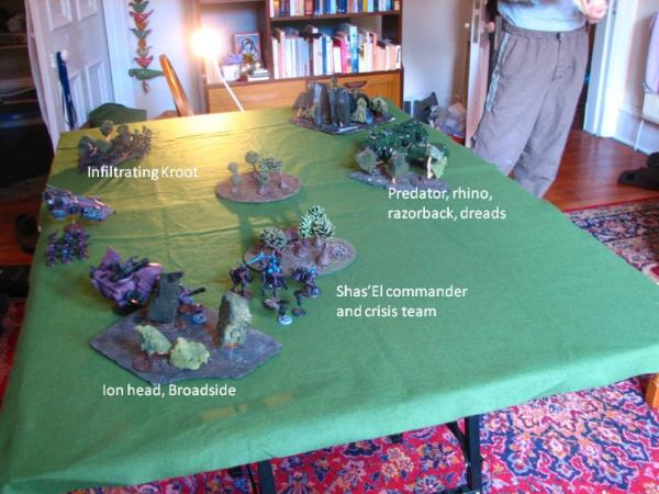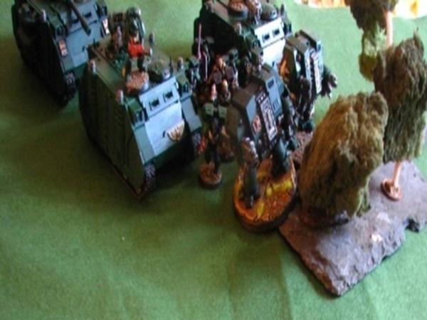 El Quixo reacted by infiltrating both a unit of Kroot and pathfinders deep in the forest, hoping to harry a tactical unit, and a second group of Kroot attempted to outflank. The other Tau units adopted covered positions in preparation. The dakka pred stayed well back to the rear of the table however angels dreadnoughts, razorback, rhino and jump troops, lead by chaplain Bartuc, were deployed as far forward as possible.