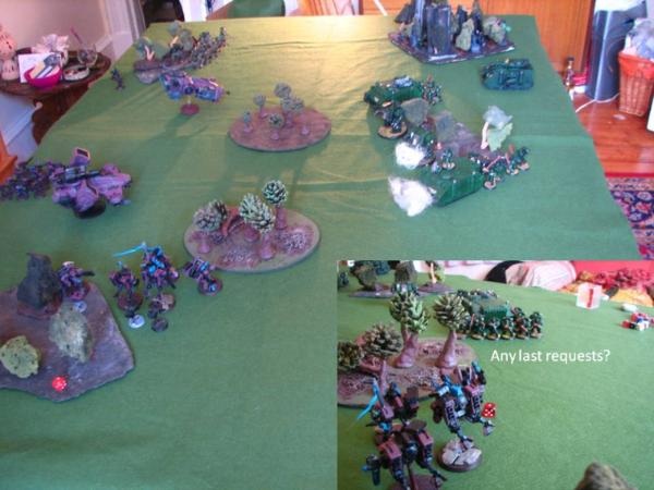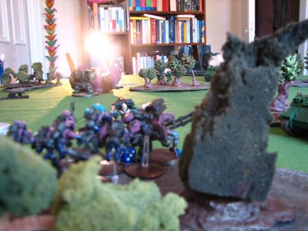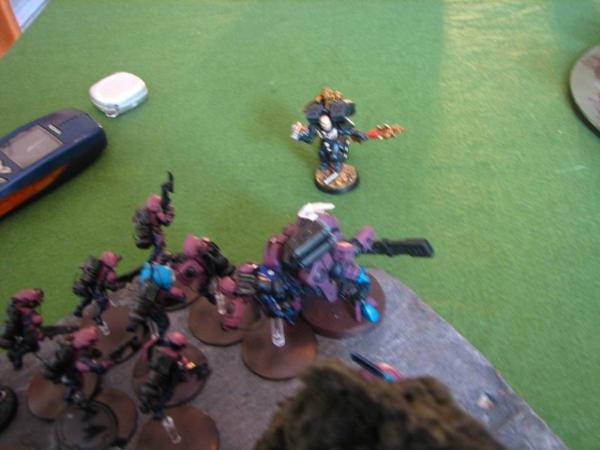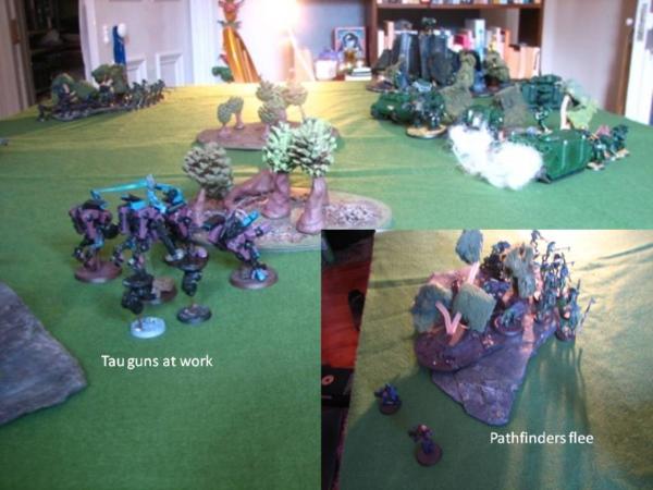 In the first turn all dark angels units advanced en masse towards the main Tau gunline. Chaplain Bartuc, seein g the devastation pathfinder-guided firepower could wreak in his minds eye, concentrated dreadnought and tank fire on the Tau scouts. The pathfinders, despite their being in cover, were massacred, the surviving troops fleeing the battle.