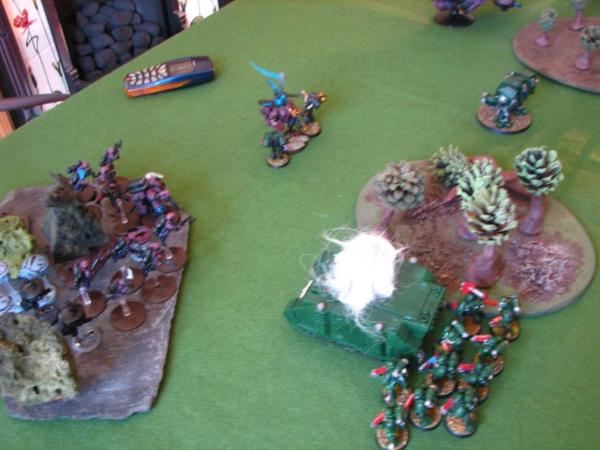 Antoch started rhyming off Tau political leaders since antiquity, his green targeting runes glowing over the Rhino as he did so. A huge explosion followed!