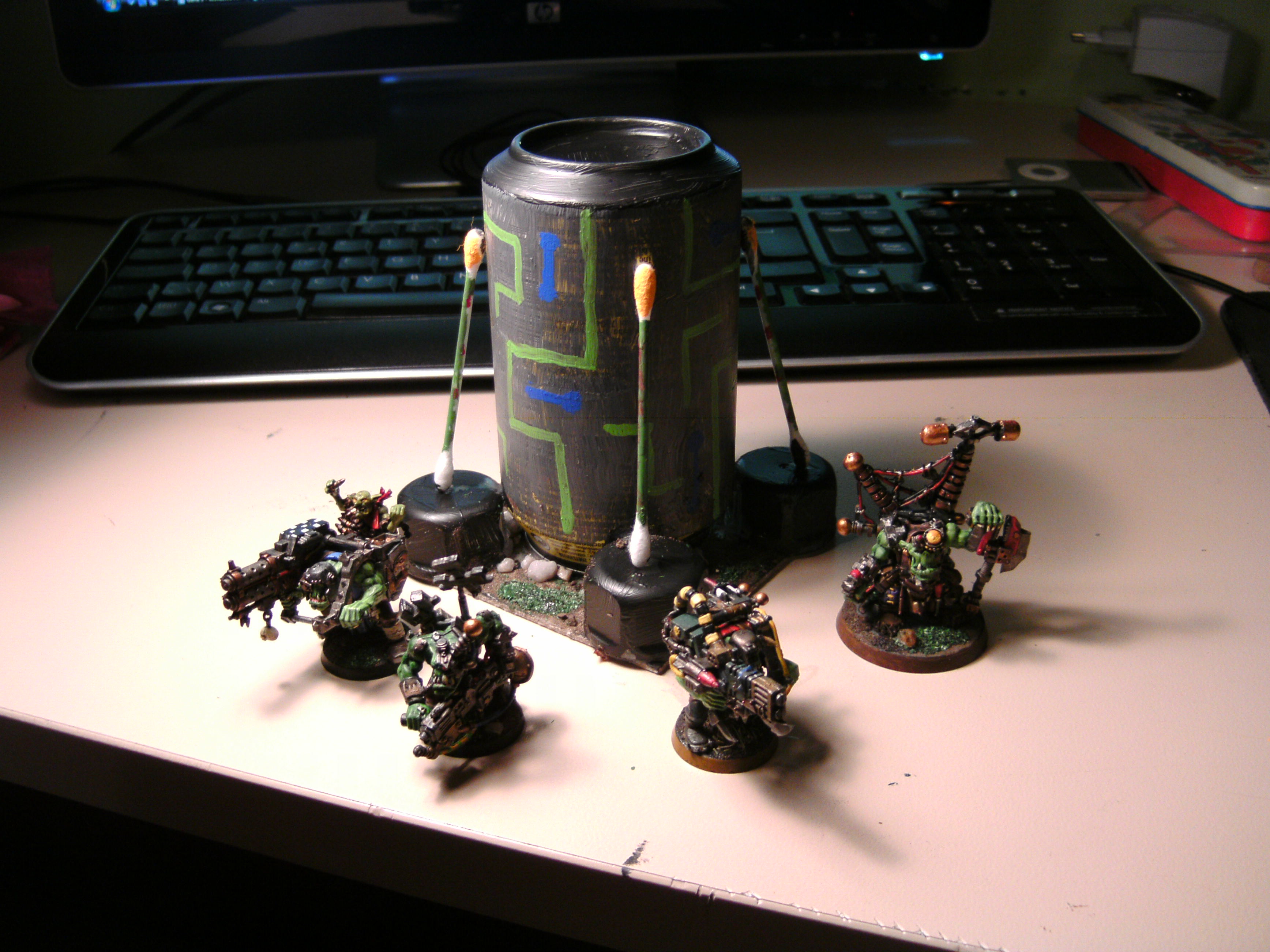 While I understand the need and fully support using common household items for terrain, I think a little effort to blend or disguise those objects is necessary. If you had spent half an hour instead of 15 minutes, I think the results would have been more than twice as impressive. Right now, it really does just look like a soda can, some bottle caps, and a few cotton swabs. If I wanted to give it some background, "generator" isn't the first thing that would come to mind. More like "possibly alien techno-shrine to the oversized Q-tips of the future."