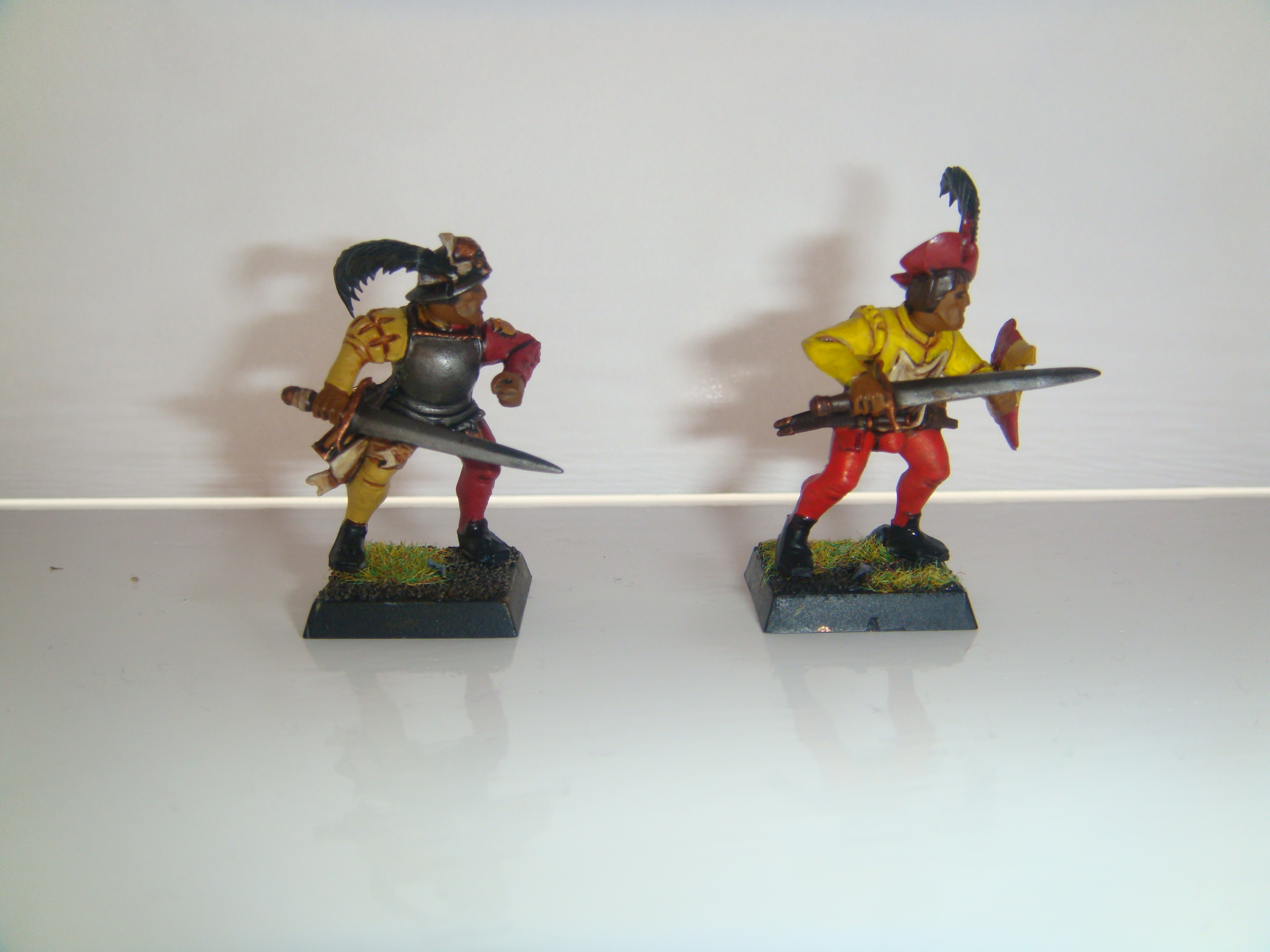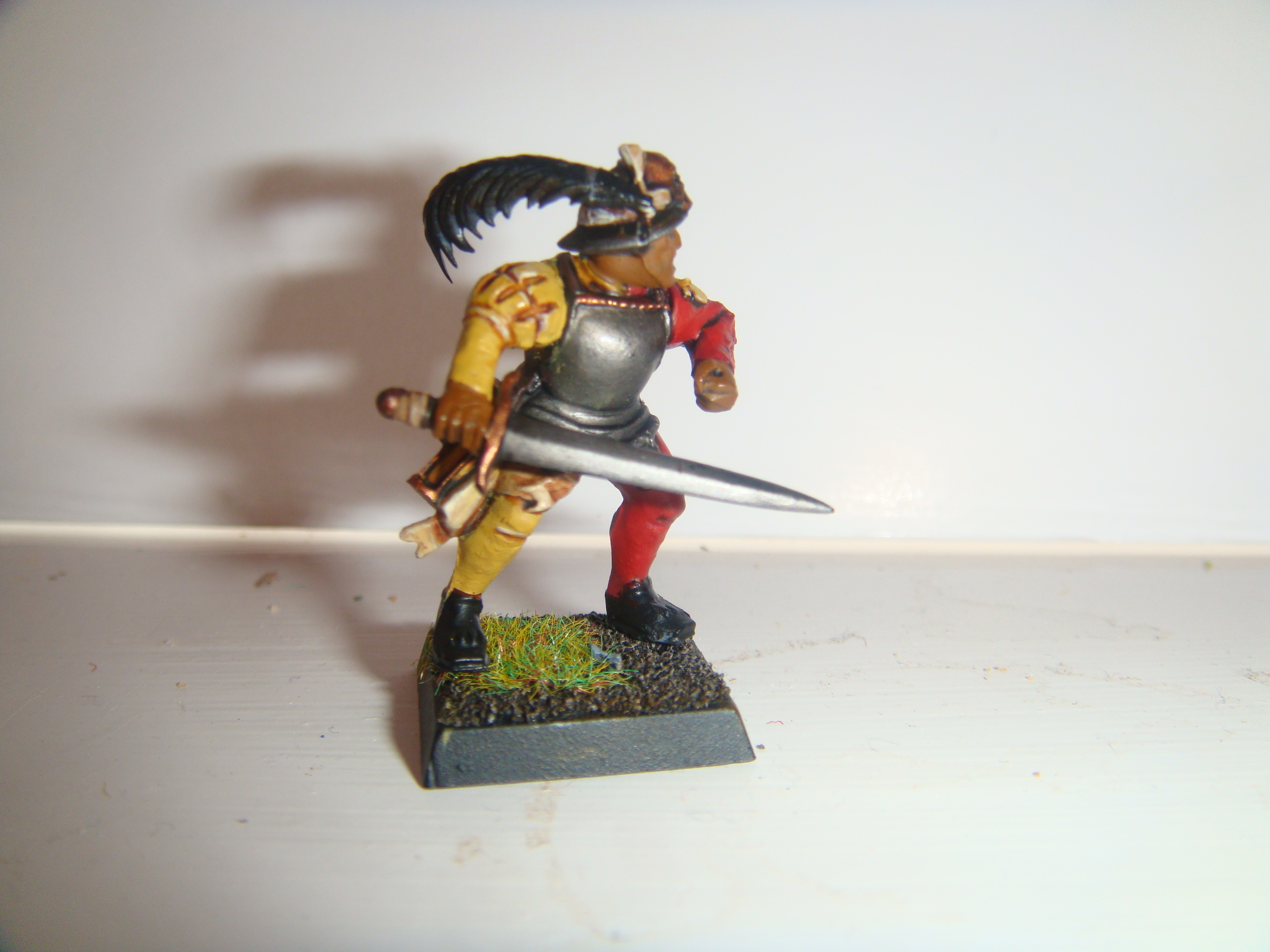 Well, onto another fantasy army! The colours of the province of talabecland seemed an obvious choice for me to do, seeing as I have never really had much practice at painting yellow, and needed some more practice with my red. But i've stuck a problem whilst painting my test figures. A friend told me that my test firgures are too subtle, and not bold enough, so i decided to paint one of the test figures, by adding blood red over the mechrite, and sunburst yellow over the iyanden. Now i prefer the unhighlighted version, but this army has happened because i want to put together are large force that can really show off my painting skills that i have practiced and slowly perfected over a few years. Now i'm sure you will look at these images and see a low quality, but these figures are about 50% complete, and i wanted to get this colour solution out of the way, so then i could finally finish the test figures off.