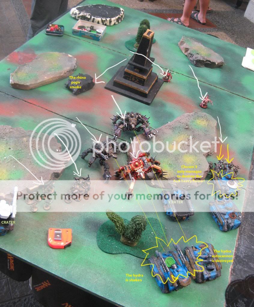 - Chaos units converge towards the IG right, with the berzerkers making a break to the other side in order to score for the breakthrough, it's rhino popping smoke.