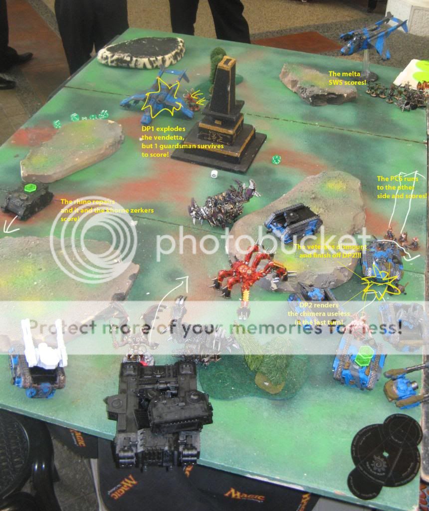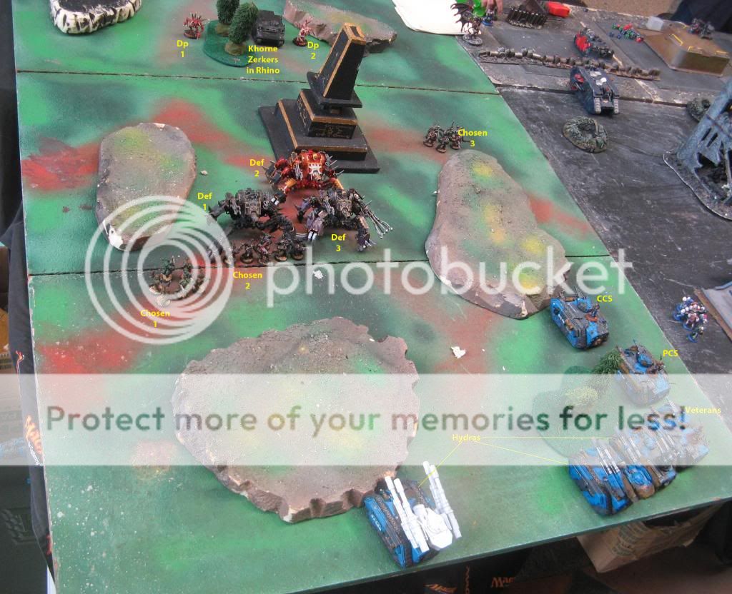 - The IG infantry continue to attempt the breakthrough. The valkryie stays put and takes aim at DP1. The PCS moves, then makes a run for, the chaos side, towards the valkyrie. The veterans bravely stay behind and draw a bead towards the rampaging DP2.