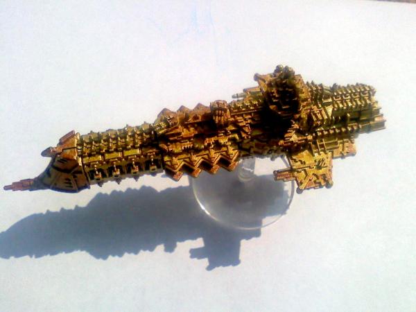 This was primed white, undercoated with Mithril Silver, washed over with Yellow ink (the prow was done with a 1:1 Yellow/Red ink). Then all was washed with a 1:4 Chestnut Ink/Water mix to bring out the detail. I think I will at some point soon paint all the guns and detail-y bits. I was excited about it, and had to throw it up here.