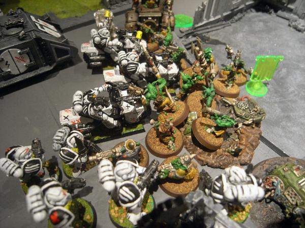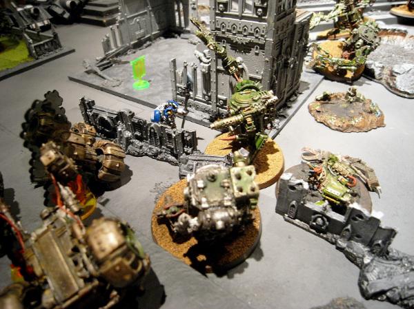 While the second Tactical Squad join in the fight against the Mek and Grots on the left, wiping them out and consolidating onto the objective.