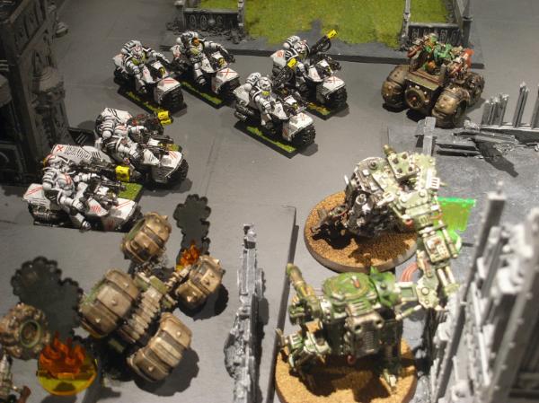 The bikers move up and Melta the stompy Kans to wreckage.