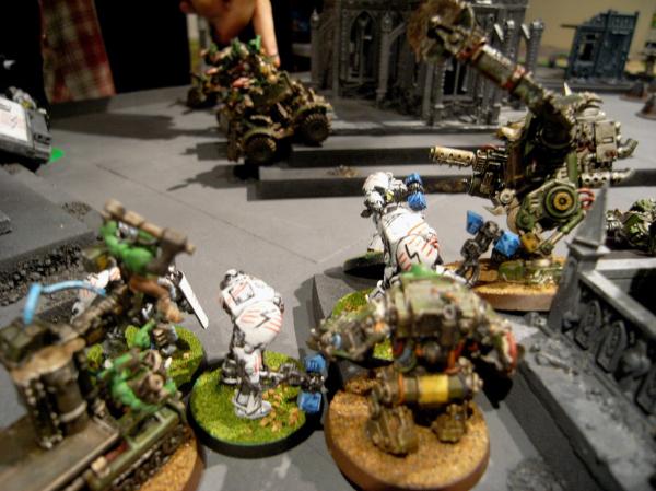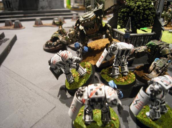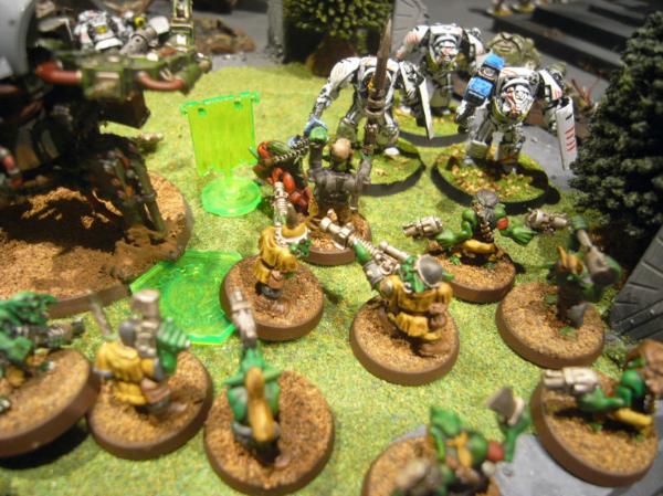 In the Grot fourth, the Megagrots and Mek assault the Terminators, but the Storm Shields do their job. The Terminators lose one, but three Megagrots die to Thunder Hammers.