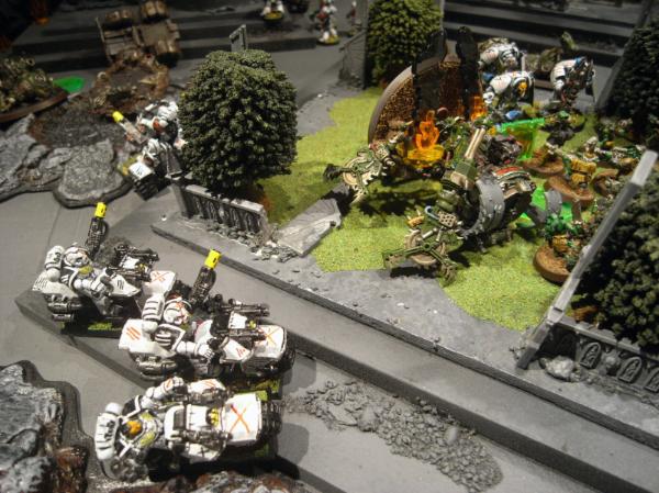 The Bike Squad takes out the central Deff Dread with Meltaguns while the Terminators charge the Grots, killing enough that they flee and can't regroup.