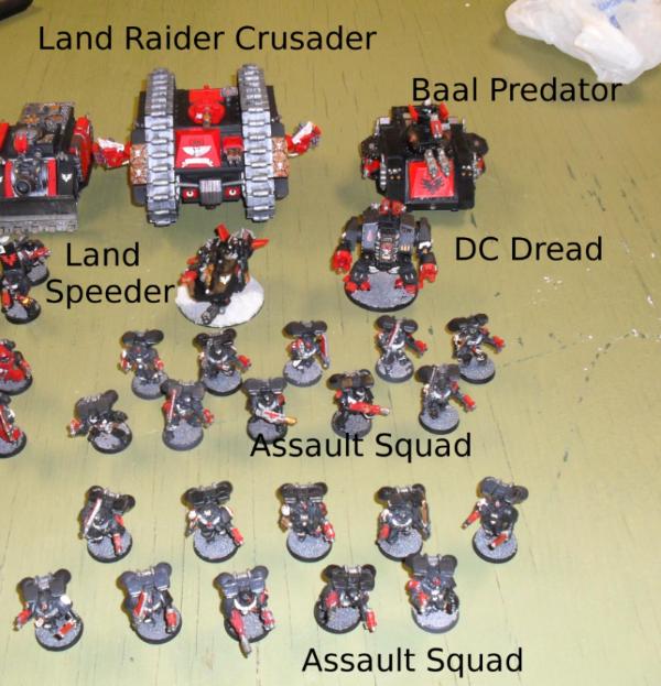 Death Company x10 with 2x handflamer/powerfist in Land Raider Crusader (Multimelta, extra armor)