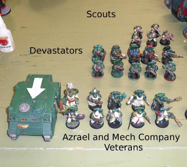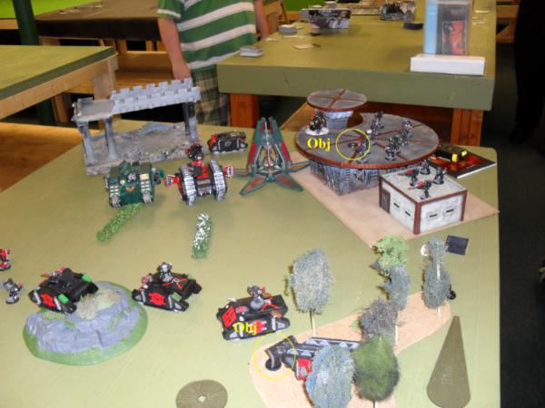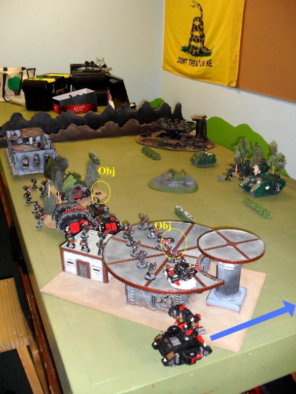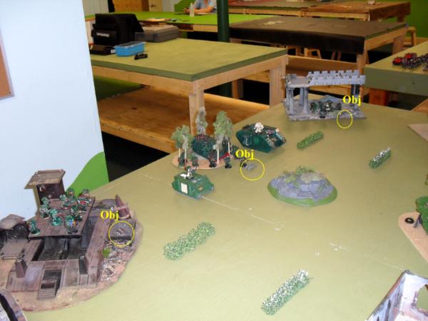 My opponent won both the roll off for objectives and first turn and elected to go first, placing his army as pictured with 3 objectives just in front of his deployment zone. The vindicator was front and center with a tact squad screening it from any deepstriking or jump pack assault while the devastator squad took up residence on the vehicle repair lift (each in front of an objective). Belial deployed with his command squad in the crusader on one side of the vindicator while Azrael and the Veterans took their place in the rhino on the other. The scouts and remaining tact squad positioned themselves near the final objective.