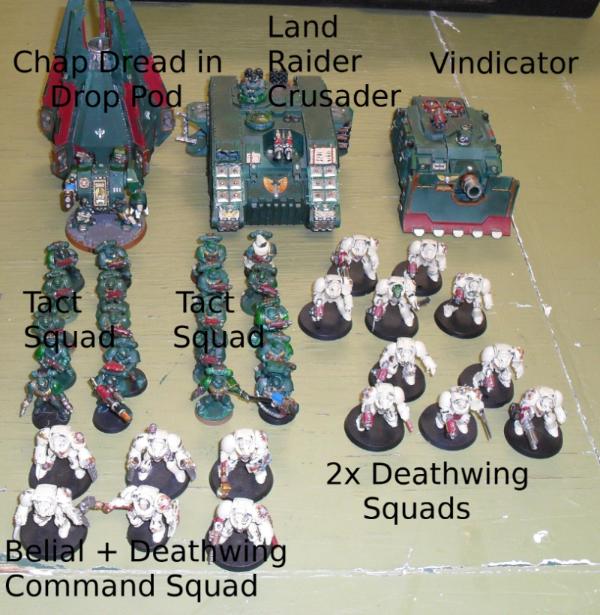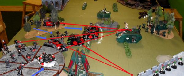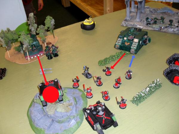 My response was to attempt to give my Land Raider (the old rogue trader version model) a 4+ save by covering the front with rhinos filled with plasma gun combat tactical squads. I didn't actually bother to look from his point of view and mistakenly assumed they were covered 50%. The Death Company (along with a chaplain and sanguinary priest) deployed in the Landraider with the final transport (the razorback with sanguinary priest) nearby. The left flank was covered by the plasma cannon