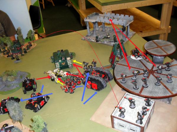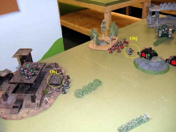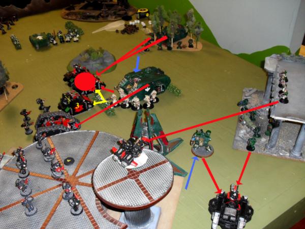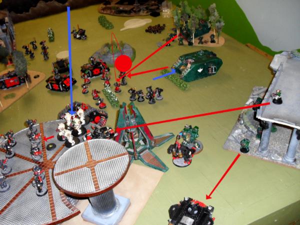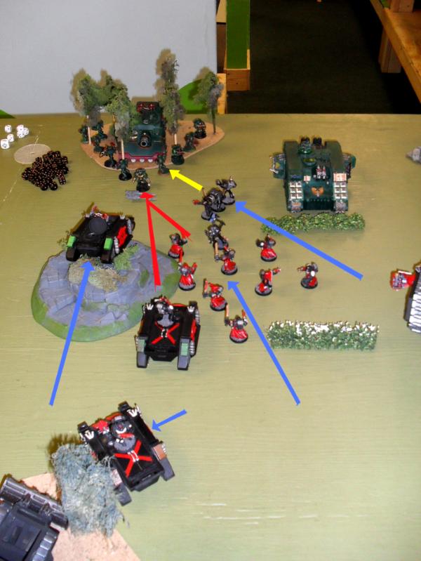 Things are looking good for the boys in black. The sons of sanguinius have two objectives controlled without any threat and are bearing down on the other three. The remaining assault sergeant moves back (deftly avoiding any trees!) onto the middle objective (since he's the only scoring figure within 20" of that area!) while the death co reach charge range of the vindicator, exploding it in the final charge with no