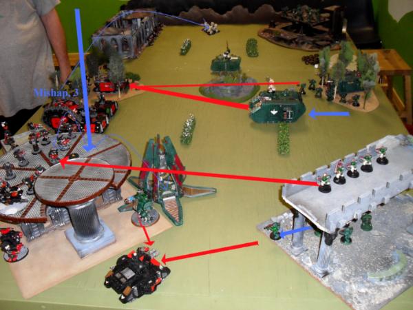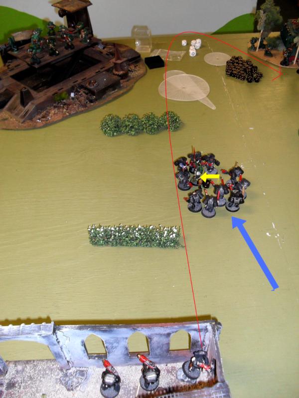 My opponent wasn't able to bring in his remaining terminator reserve squad so he continued with his turn. On the left, Azarael and company dismounted from their vehicle and moved laterally while the transport moved to block