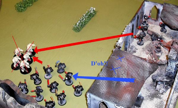 dev squad targetted the oncoming reclusiarch and his squad, killing several but failing to affect their resolve due to the rousing oratory of the reclusiarch (fearless).
