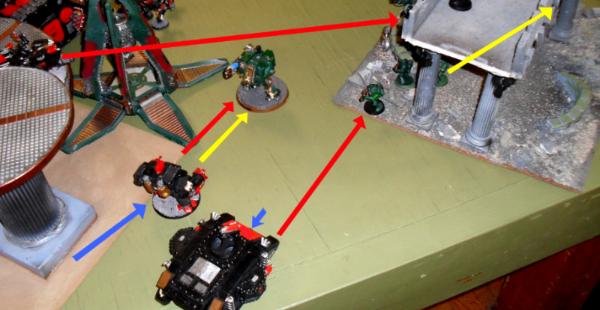 pics, they were generally taken at the end of each player's movement phase with blue arrows representing movement. Red arrows are shooting while yellow is assault and fall back (with units wiped out in the appropriate phase or vehicle damaged crossed out with the appropriate color). Without further adieu, here are the opposing forces...
