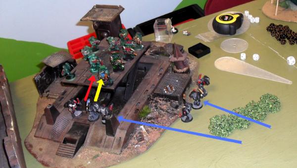 Both the Deathwing and drop pod assault rules came into play on the top of turn one and they both attempted to deepstrike onto the landing pad... and deviated. The drop pod with its Chaplain dreadnought skewed down onto the ground while the terminators (unable to use the locator beacon.. which i forgot was on the drop pod in my shooting phase... again!) mishaped onto my combat squads, rolling a 3 and allowing me to deploy them. Naturally, I put them in front of one of my assault squads and in full view of the plasma cannon