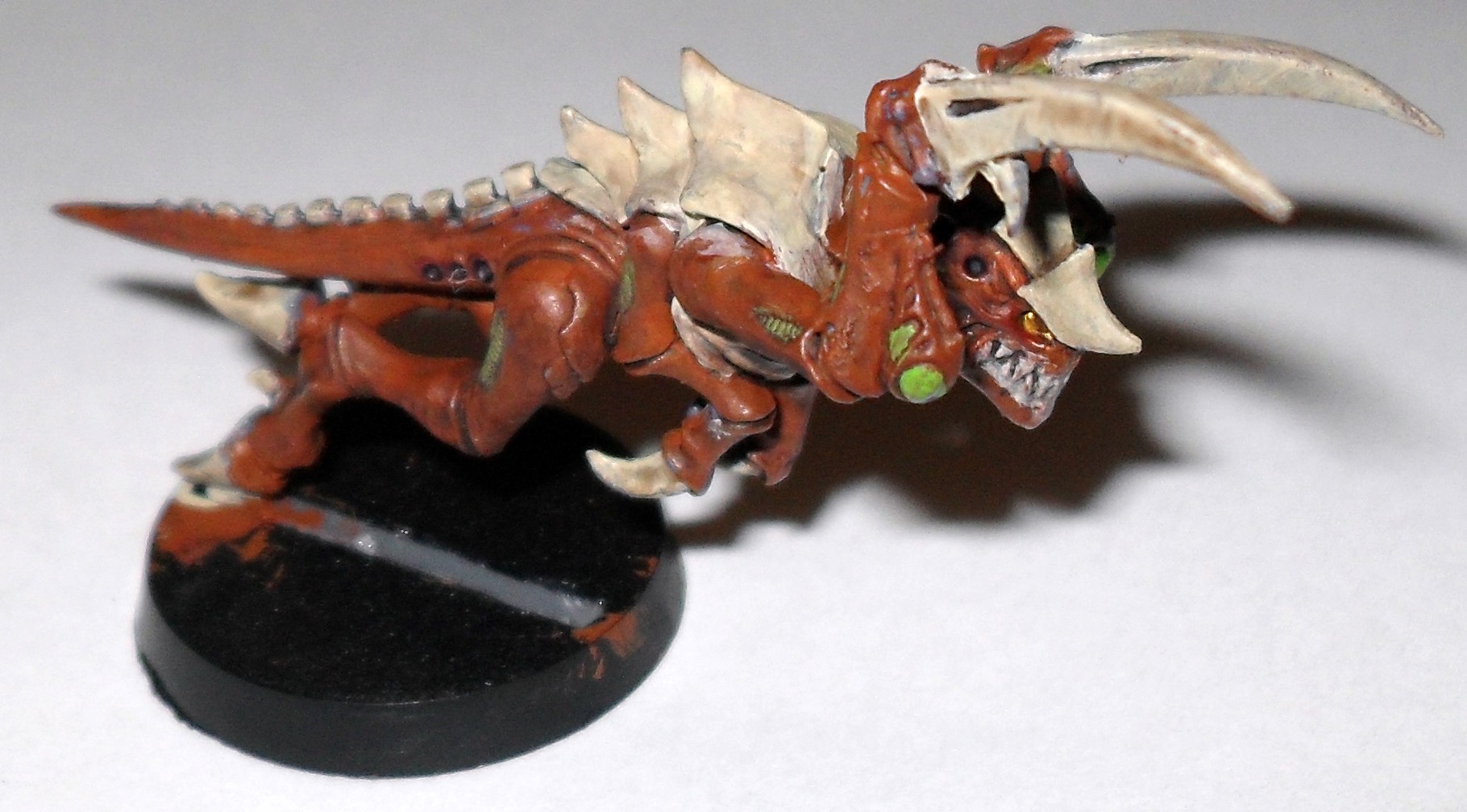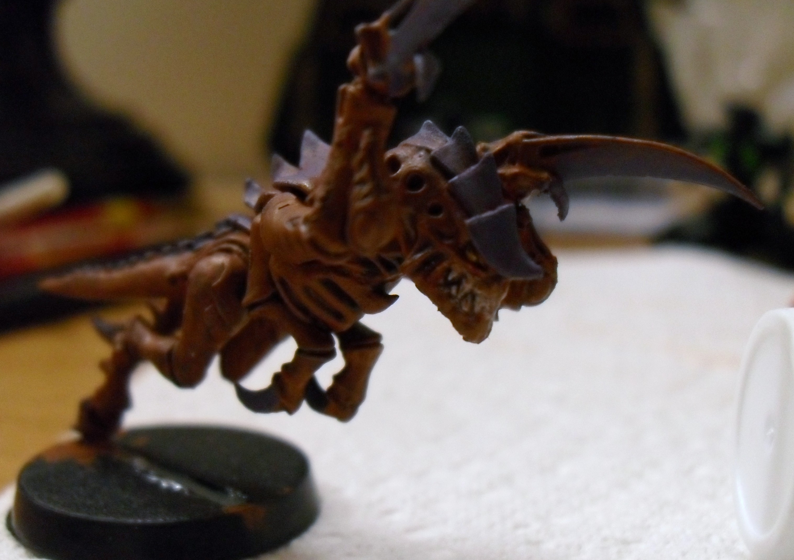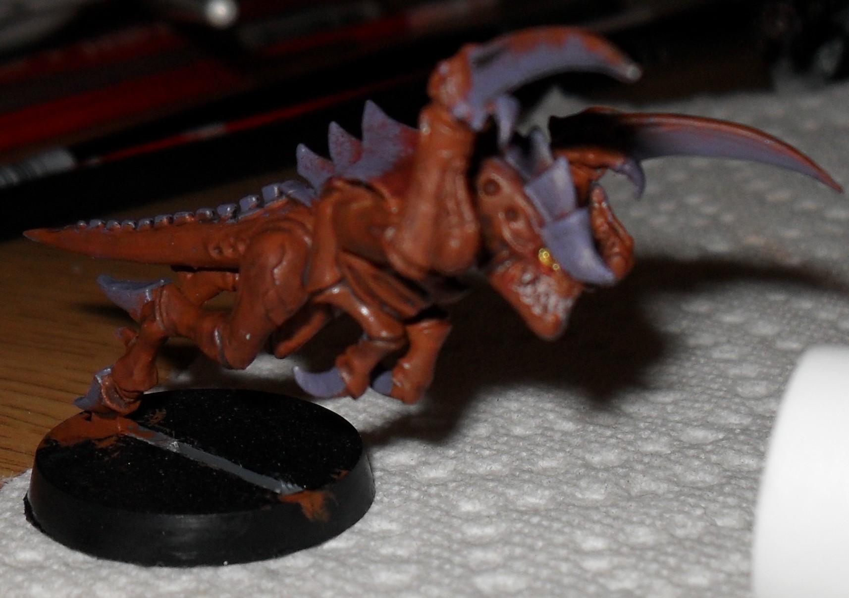 Yeah... while the dark fleshtone seems to match a bit better in good lighting... which is for some reason very tough to find around here... I could probably have used a lighter shade. Maybe snakebite leather? The purple was I guess from my recollection of the gameplay where a colored shade was on all of your units for team recognition or something. I dunno. Perhaps a bleached bone accent instead of the hormagaunt purple?