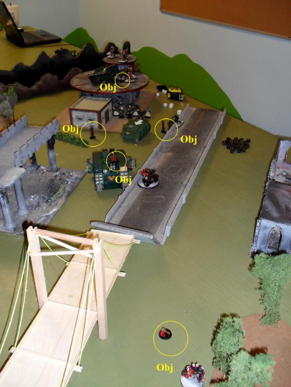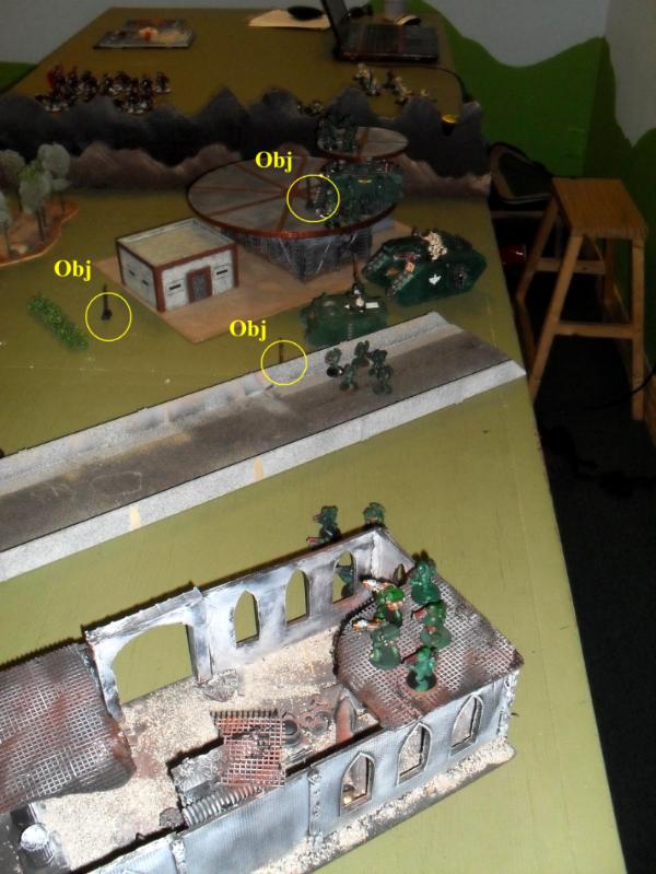On the right, the Land Raider advanced 6" towards the highway and opened up on the objective claiming