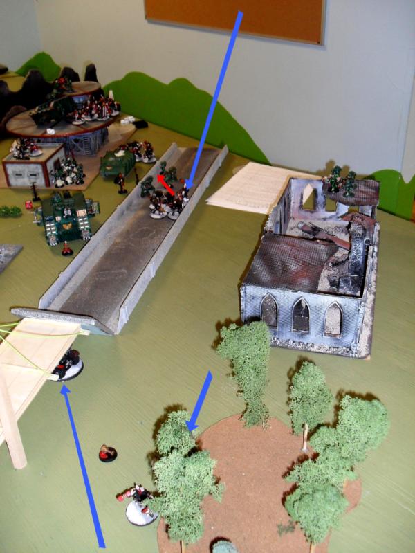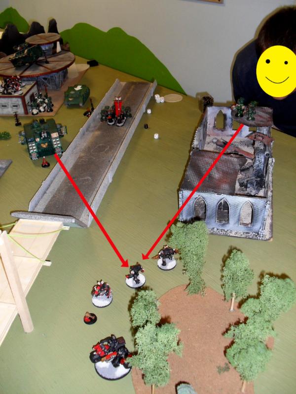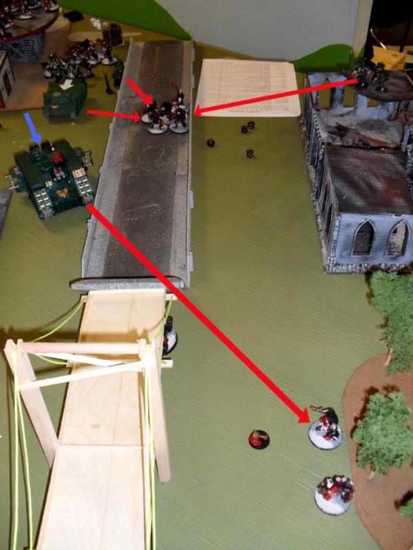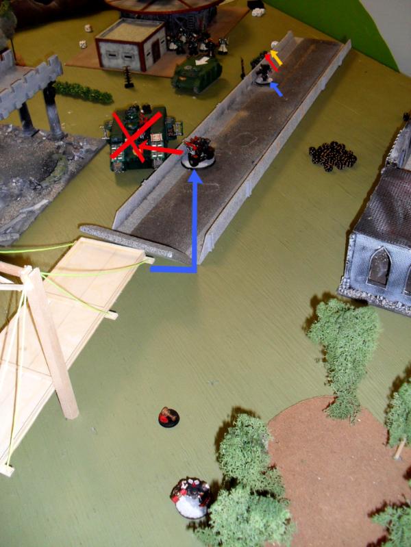 The remaining terminators by the forest retreated deeper near the woods and hopefully out of range of the plasma cannons (but still close enough to claim the objective). The attack bike moved under the bridge and out of