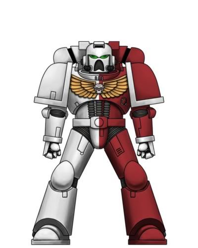 4/10 - The red-and-white scheme is very nice overall. It looks like a Swedish or Red Cross Marine. However, the purple helmet seems odd, and the half-white codpiece seems questionable. The asymmetry on the arms is great. I've always loved asymmetric Marines. Overall, the purple helmet is really distracting and doesn't seem to fit at all.