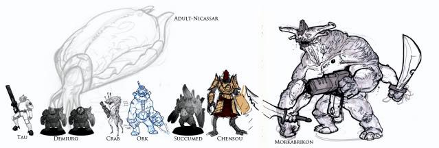 "The Morkabrikon is a huge leather skinned beast that hides in asteroid caves on the farthest rims of the Tau Empire. Feeding on mineral ore found in the asteroids surface, low gravity and a hearty diet of rock have made these creatures into lumbering masses of muscle and rock like skin. Uncommunicative as a species, Morkabrikon rarely seek out the company of the other Morkabrikon except when they need to mate. Highly territorial it is inadvisable to place more than one of these on a battlefield at any given time. Thankfully their brains are housed close to the top of their skull, and are relatively primitive in nature. A simple drone controller implanted into their frontal lobe allows full control of their behavior, mood, and cognitive motor functions. This both eliminates them as a threat to passing Tau ships, and utilizes them as a powerful assault soldier."