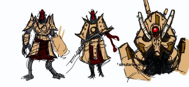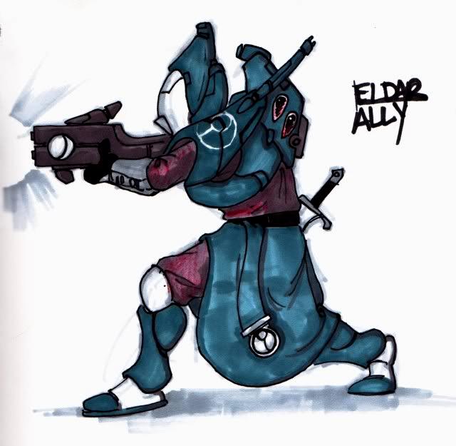 I imagine the Chensou as a warrior race of little technological advancement. All of their weapons and armor are gifts from the Tau. I imagined the Chensou weapon to be handled almost like a samurai sword/shotgun mix. The gun would be short barreled and rapid fire, terrible accuracy but good for surpressing an enemy when your running in. The guns bayonet would be extremely long,the length of a katana and similar in shape."