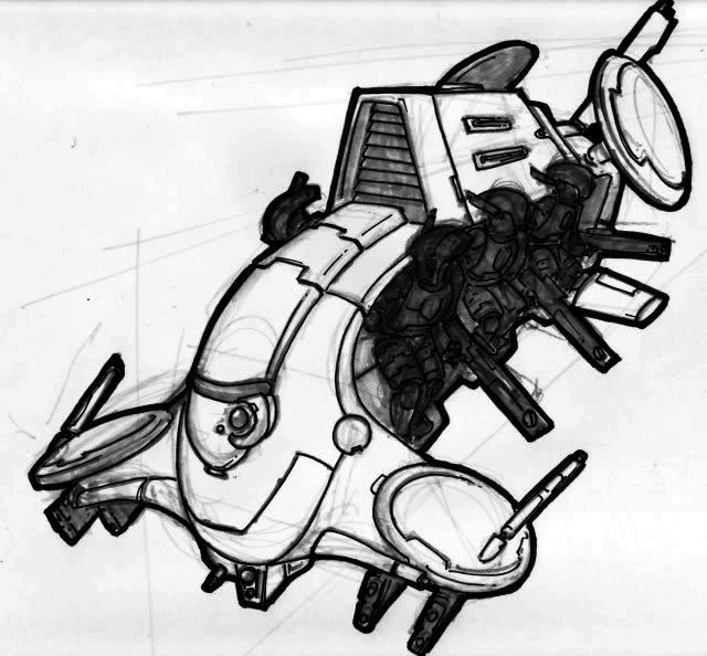 "The Sawfish acts as a medium between the Devilfish Troop Carrier and the Piranha support craft. Able to carry six firewarriors, armed with two gun drones, and boasting dual vehicle mounted sheild generators, the Sawfish turns normally static fire warriors into small mobile firing squads. Without the sheild it has medium armor and has one pilot, the firewarriors attach to the sides and are exposed, spare for the massive sheilding. Firewarriors can fire from the sides and count as firing from an open top vehicle."