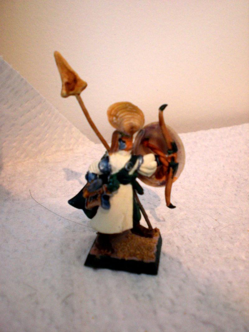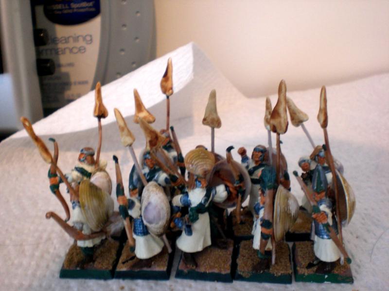 I started with basic archers, then made the spears from green stuff and wire, and the shields from real sea shells (er... river shells, I collected them from the dried bed of Bull Run).