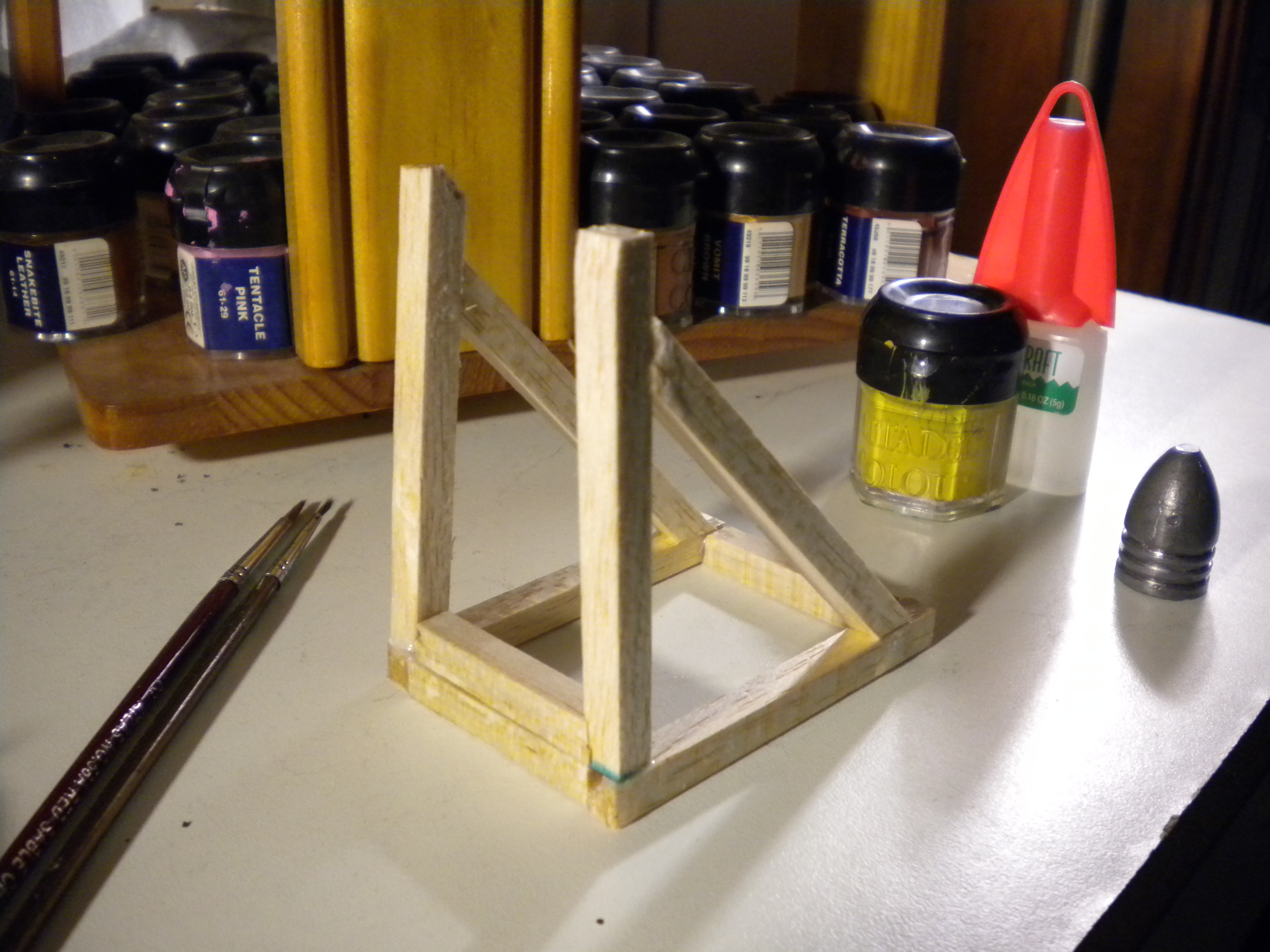 Making a skaven-rickety trebuchet structure should be pretty easy. I'm thinking of using a bell as the counterweight.