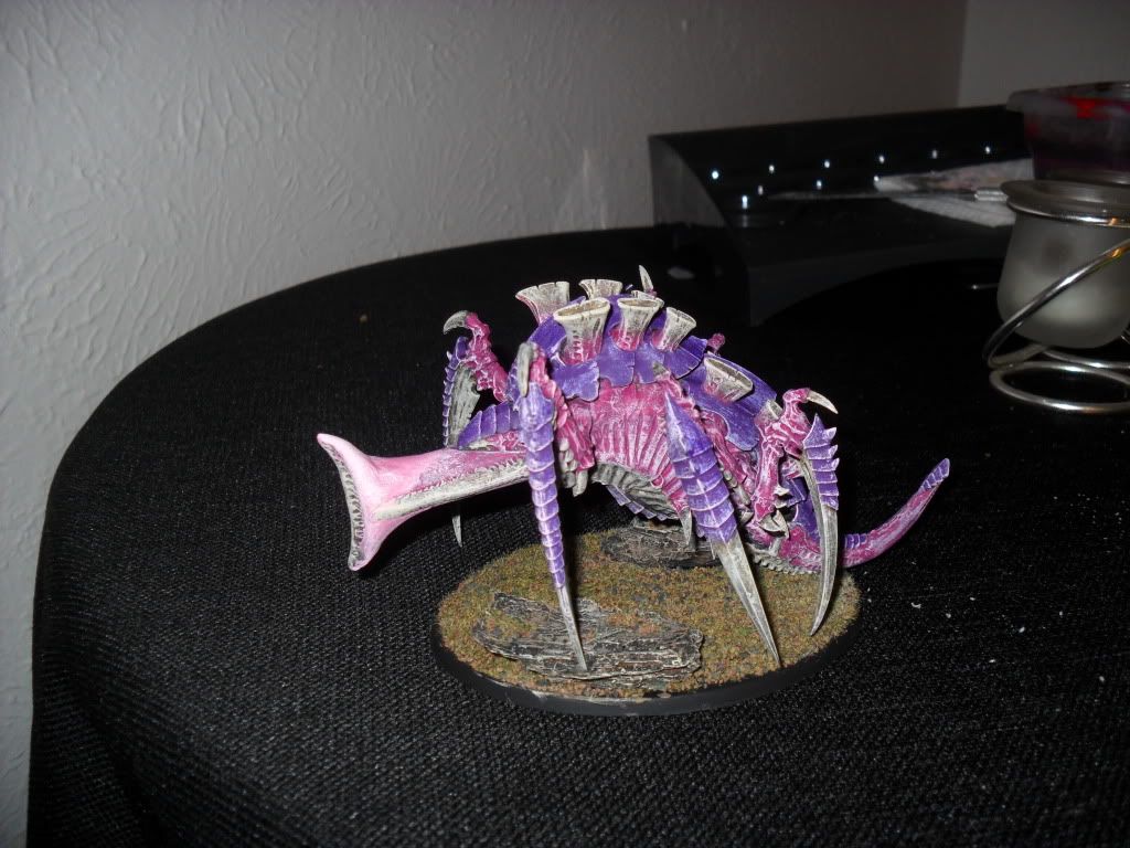 Kroothawk already posted a link to my finished T-Fex, so I won't post another picture of it, but yeah, make a Carnifex bigger/beefier/bulkier and give it a really big gun. Personally I would mount it on the large oval base like what comes with the Trygon. The theory being that the 4 wound Tyrant and normal Fexes are on the 60mm, while the 6 wound Trygon gets the large oval, so I put my 6 wound Tervigons and T-Fexes on the large ovals as well.