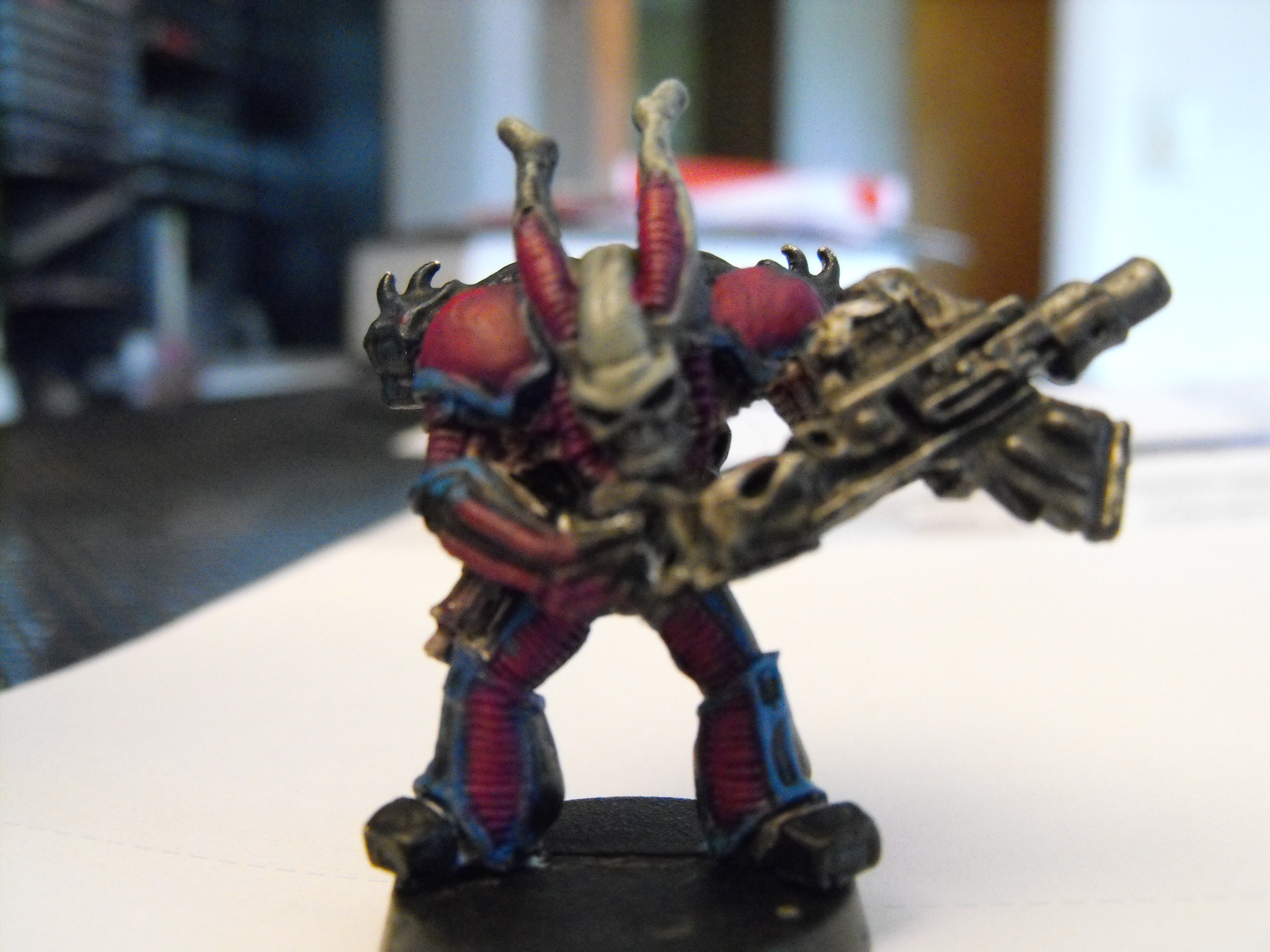 Alright, so a long while ago I showed off an attempt at a color scheme, but it was all purple more or less. And now I've got a new one that I think is better, but might be too busy? It's being used on an older rogue trader mini. He needs some touch ups in the trim areas I've. But it's the basic idea.