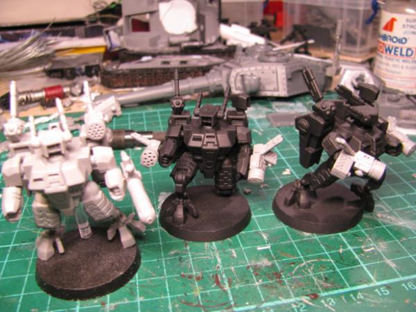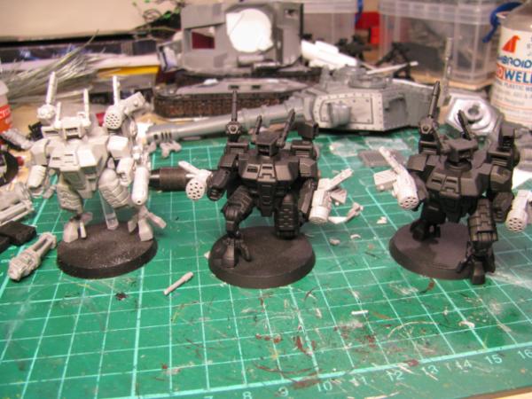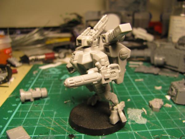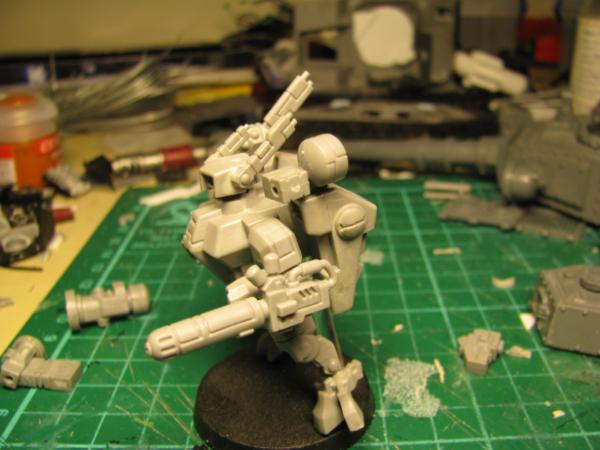 I find myself fiddling with plastic quite a lot these days (mostly waiting for Starcraft missions to load). As well as the random, unproductive footling with my Guard stuff I ended up asking myself how Tau Missile Pods actually work. I mean they are all over the place, arguably the best weapon you can put on Crisis suits and yet they don't look like they would perform in the way that their stats indicate. Specifically they are tagged out as a rapid fire weapon designed to engage medium armour (infantry and vehicle) and yet the model for them is a small rectangular box with 3 missiles only. I suppose they could be doing clever things with submunitions, but I don't quite buy it. Hence my latest fiddling has come up with some relatively simple alternatives. Please feel free to comment, add to the discussion, or generally lambast me for daring to question GWs all mighty greatness! As a base line, here we have the classic GW version in its natural habitat, i.e. attached to a fireknife suit: So far, so standard. And now onto the variants, starting with a model based on the idea of a larger missile fed from a magazine (Wing). The Burst Cannon base is a really nicely detailed bit of kit and even includes a blast deflector for the rocket exhaust  I think the launcher works well, but less convinced by the magazine. A similar idea to the first, except a much smaller package (Smallbore). I suppose its a more rapid fire version with smaller rockets. Its a little bare for my full liking but I do quite like the drum mag look. And finally a variant working on the assumption that the weapons effects could be replicated by a pod ripple firing a lot of micro-missiles, rather than a smaller number of larger rockets (Ripple). Again on the assumption that the pod can be reloaded on the battlefield by some kind of magazine (hence the flamer tank at the back). So, thoughts?