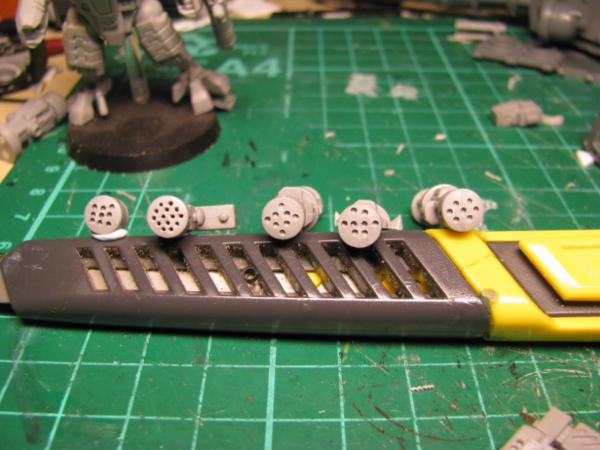 @Marvlev - I did think about having a missile pod of that nature, but again I felt that something like that with large missiles would not be self-reloadable in the field. Otherwise to keep up the advertised rate of fire would require a foolishly large pod for a battlesuit. Automatically Appended Next Post: Hmm.. and after some tests I have concluded that it is fiendishly difficult to get the larget holes to line up as neatly as the smaller holes