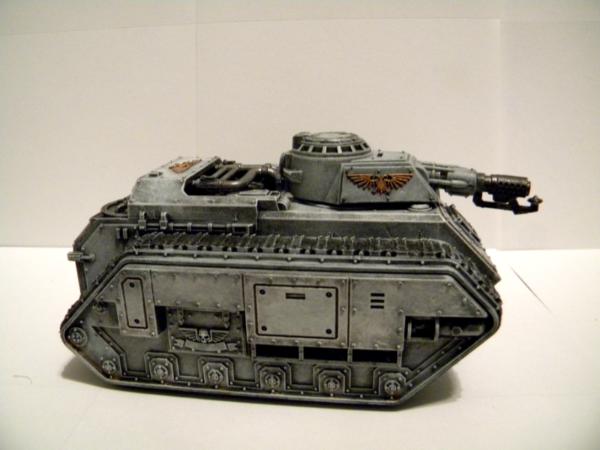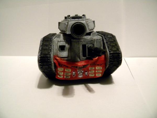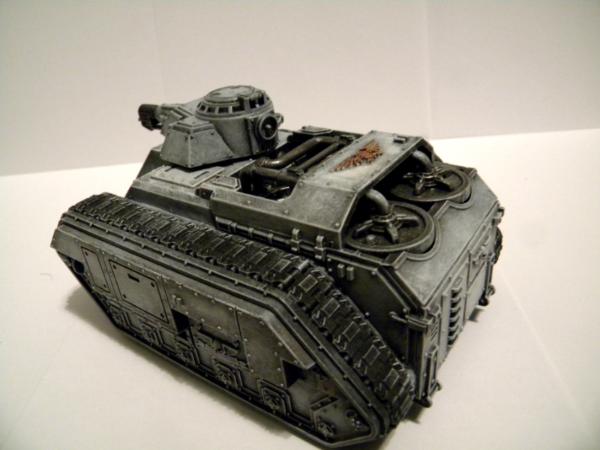 Sure no problem. first I dry bushed the whole tank pretty heavily with boltgun metal. Then i painted vermin brown (if you're doing blood angels you might want to mix in a darker color like beastial brown so it showes up better) anywhere i wanted rust to be, don't worry about putting to much on because most of it will be covered up later anyway. then I dry brushed a layer of codex gray (you might want to go with something like scab red or gore red, something that is a significantly darker than you final color) on over that until it covered almost all of the boltgun. Then I dry brushed on a layer of skull white (or in your case blood red) on top of that, thats the layer where you get all the shadows and such, really you can do this as heavily or lightly as you want depending on what you want the end result to be. That's really it, after that its just a matter of painting the details. You may also choose to water down whatever paint you used to make rust in the beginning and reapply it over the original depending on how weathered you want it to be.