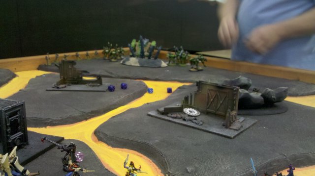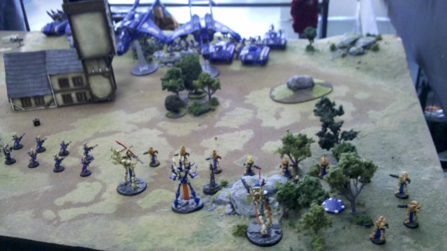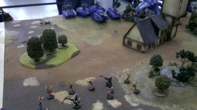 So, I decide that discretion is the better part of valour, and Eldrad redeploys the Wraithguard and lords behind the big building. I've got my harlies and jetbikes near the table center, and he's packed in a corner.