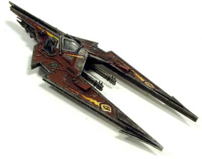 i want to add plasticard to the tip oh the wings and make them pointy as well as a small tail fin type tthing. see the wings how they fold in an out? well i noticed on the hell blade theres a dip in that area so on the starfighter the grey area beneath/within the wing i cut out!, im also going to cover up the cockpit.... maybe.... oh and i'll make tubes comeing out with guitar strings. one pair of autocannons on the hull another where the lasers are Automatically Appended Next Post: p.s painting a chaos star like dave taylor?