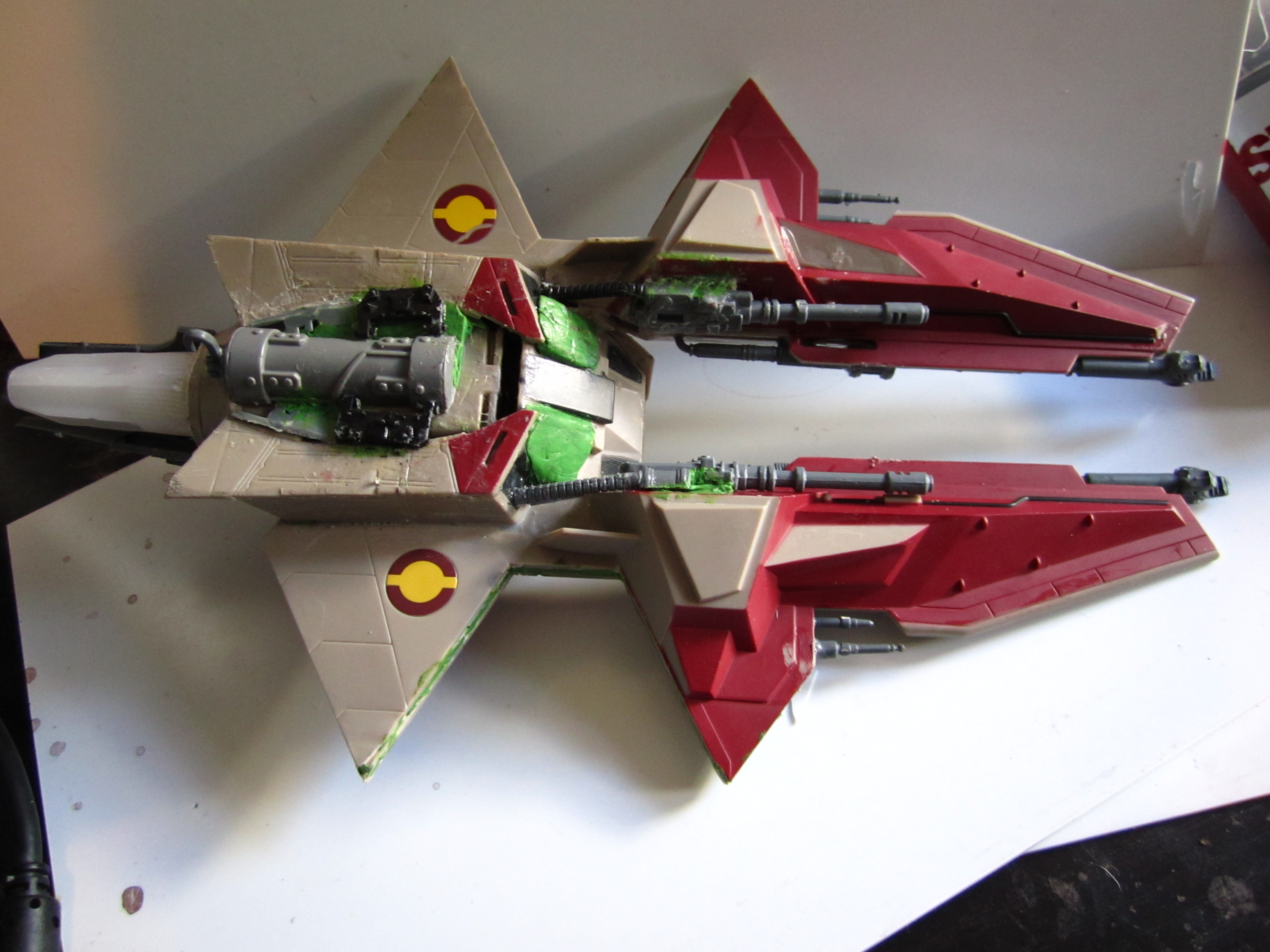 Sanguinary Dan wrote:I think it should be very simple. Add some jagged edges with a few triangular plasti-card blades and hatches to the main wings, delete the R2 unit, angle the vertical stabilizers outwards (with a different angle for the top pair than the bottom), add some pipes around the engines and paint the front of the cockpit in a chaos star pattern. And lots of icons. But use painted or brass etch. The plastic from the vehicle sprue is too thick for aircraft.