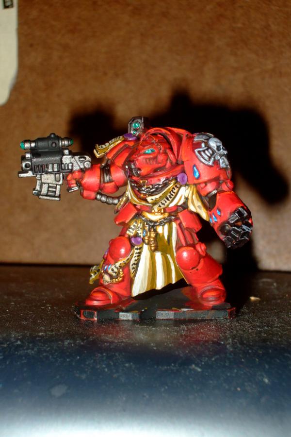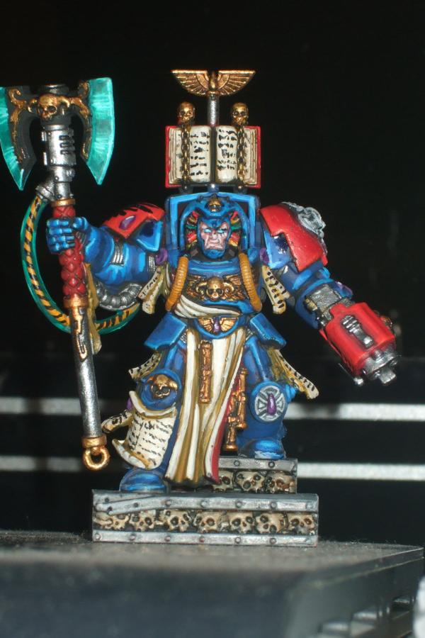 After a hiatus from my Blood Angel adventure (I had to take a break and buy a tattoo studio), I finallly got to sit down and finish up my Librarian. Here's a pic.......