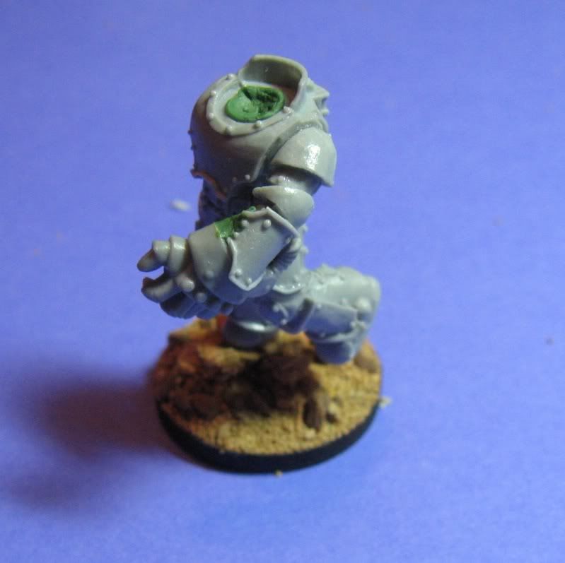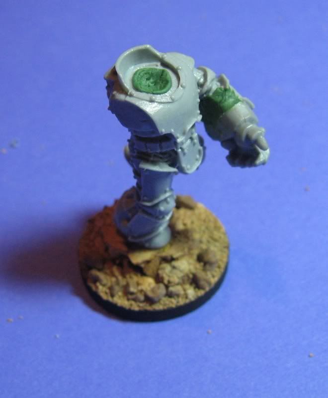 I attached the chest piece next, and added the power fist arm. I adjusted the arm so that the hand is pointing forward. You can see some of the green stuff for the neck and on the power fist in these pictures.