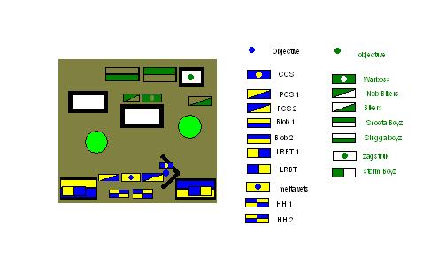 LOS was slightly blocked by a ruin right in front of them). Next to the nobs slightly left of my centre he put the slugga boyz. Zagstruk started in reserves.