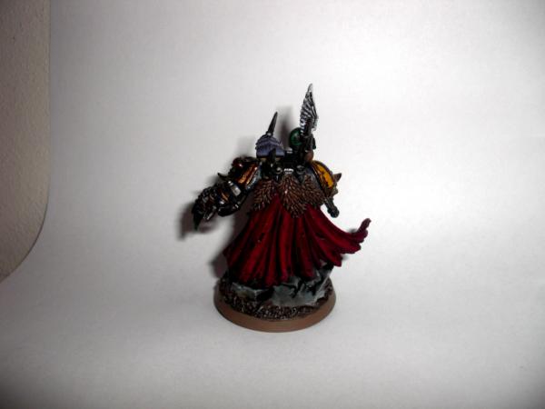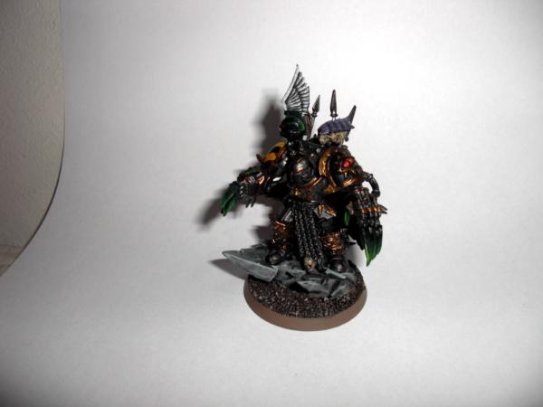 Chaos black base with Ice Blue for the primary "power" color, then some skull white highlights. Biggity bam, tons of contrast with the darked metallic scheme.