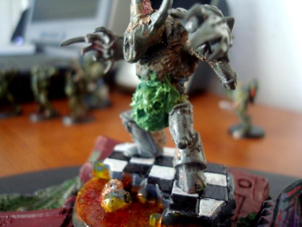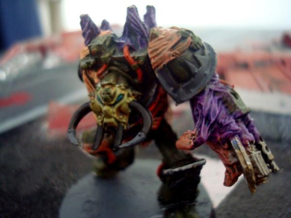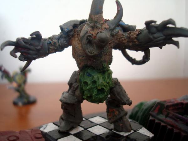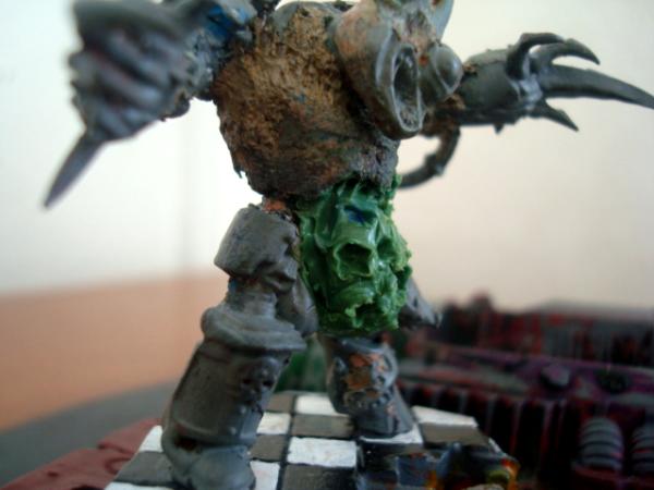 Mostly to the Plague Bearer, and any units you might use this scheme in the future. The guts are a light purple which could be darkened a bit and around the wound where there is blood with the blue skin. Darken the red and blue around the edges and have the blue get a bit lighter as it reaches the top of the model. Not only will this help with shadowing, but it also makes the colors richer and the blood look like it has stained the skin and has been there for a while.