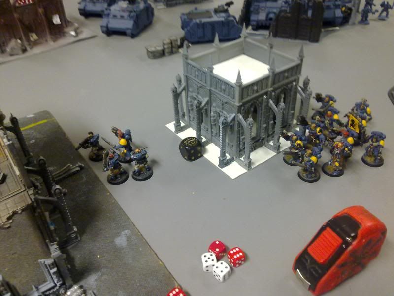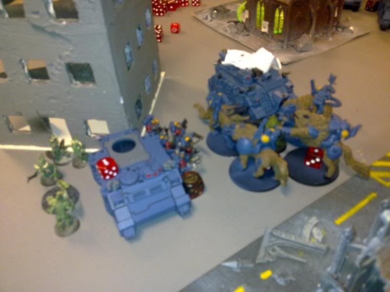The rune priest and his squad disembarks from the rhino, I will just have to use them against typhus instead. I move my remaining vindicator against the action, and move the other rhino out of the way, immobilizing it in a ruin in the process.