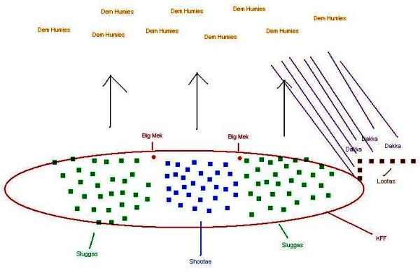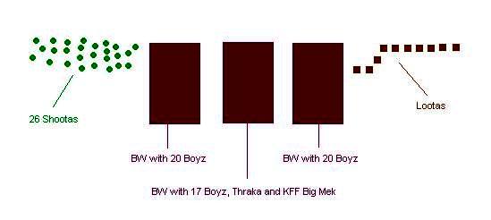 The goal to use the Battlewagons travel to the enemy, ram his tanks, jump out and destroy! Lootas provide some cover fire and pop transports and the Shoota Boyz come in and mop up, I may even use them on the side of the lootas to provide some protection.
