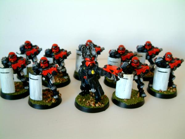 theocd wrote:Absolutely beautiful. In addition, nice to see a full Arbites Army. If I had the money and space that would be my next topic, for now, the Necromunda gang will have to do. Are you using BOLs rulebook? Or counts as IG/Inquisition?The OC-D Thanks - I use WitchHunters rules - the regular squads are IST, the boltgun squads are Sisters. That's why all the boltgun guys have riot shields - to represent their additional point of save. I don't use the Act's of Faith rules. I then take inquisitors with 3 crusades as my 'Shock Maul and Supression Shield' squads. Medium of Death wrote:Impressive. Most Impressive. The full army picture is really striking. If you do indeed choose to repaint them is there any kind of colour scheme you have in mind? Thanks - I think they'll be a similar scheme - just with more detail. I haven't got the stomach to completely strip and repaint 100 identical Arbites. I'd take the opportunity to make some of the conversions a lot better, put highlights on the red areas, more detail on the flesh parts overall, put in some brown leathers for coats, repaint and wash the insignia and heraldry, replace the silver parts with NMM, and rebase them to something simpler.