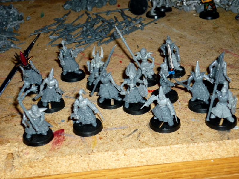 Since the new models aren't available yet, I'm starting with models that I'm going to have kitbash. For starters, the new Wrack units. I've broken out my bitzboxes, and combined them into the following monstrosities. There's bits and pieces from High Elf Spearmen, Dark Elf Spearmen, Dark Eldar Warriors, Warhammer Zombies, classic Warhammer Skeletons, Forgrworld Renegades, and more!