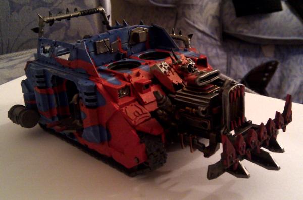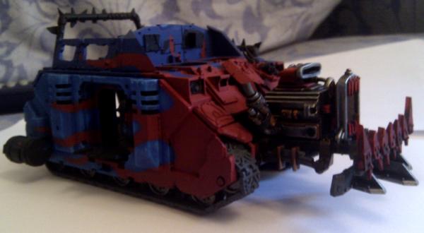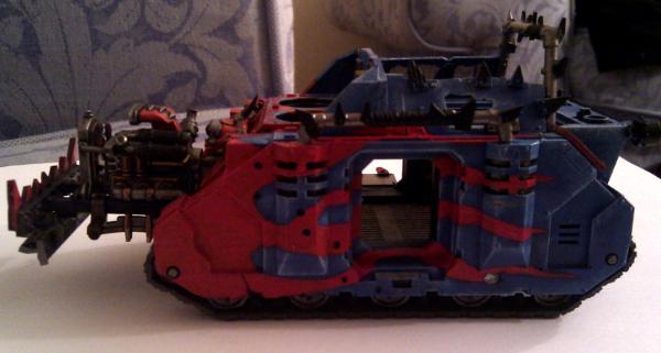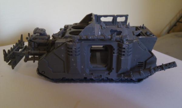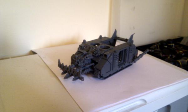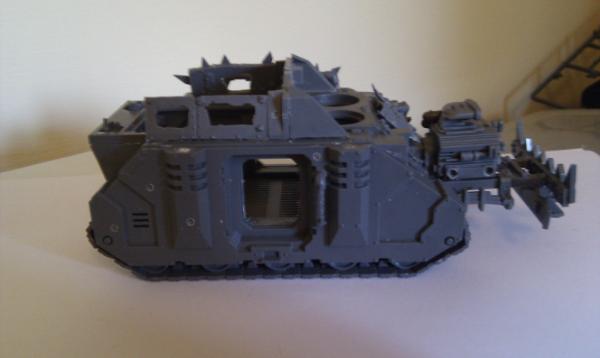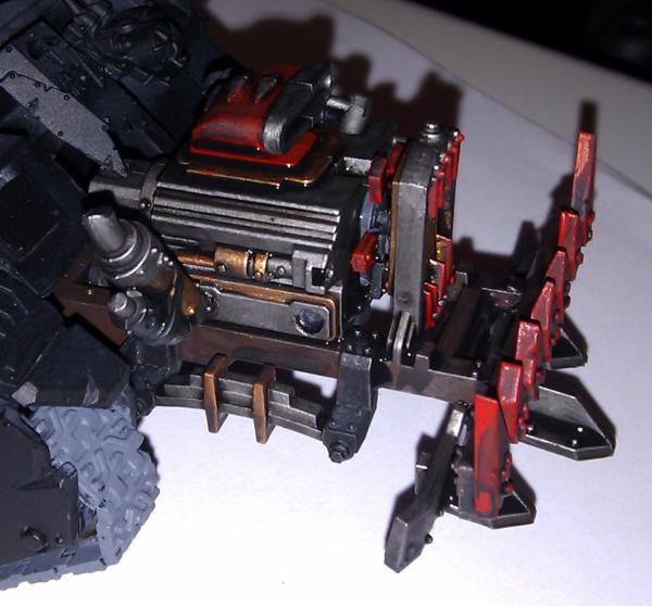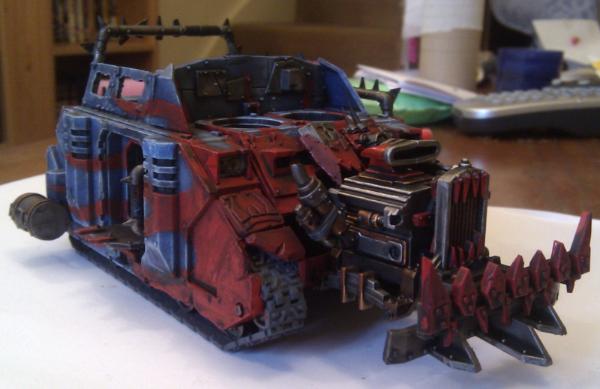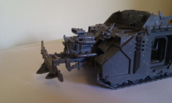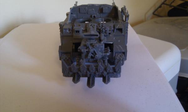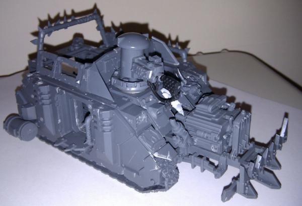 although the parts look cool together the engine doen´t make sense sitting on the spikes of the rhino. what engine would work that way? not eaven orks would build that way. i understand what look you tried to achieve but for this there should be some hydraulics or something that transports the motion from the engine towards the tracks...