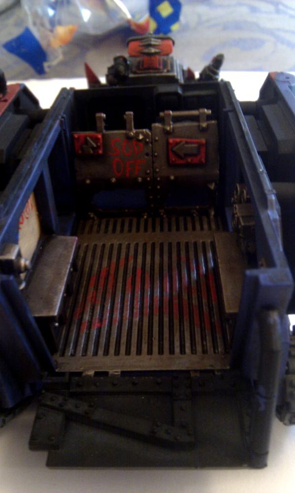 So now I'm onto the hull. My idea for the vehicle is that it is an old Ultramarines Rhino, they come in blue, and that's Gork's (Or possibly Mork's) favourite colour. So it wouldn't need to be painted. But Red ones do go faster. How would an ork try and mix red and blue?
