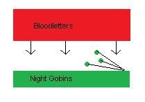 I dont see a restiction on how or where the goblins are released. That way they will take hits on the charge and more hits as they Fanatics go into their Death Throws.