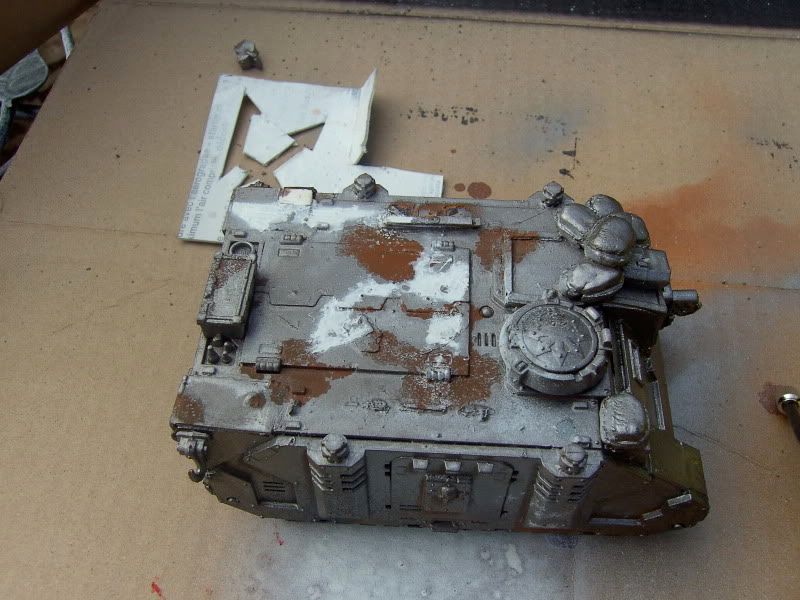 all i've done is basecoat it in black then put down a red primer. i'm going to build onto area for the rust, then mask it off, then i'm going to use red spray paint. from there on in its all hand techniques.